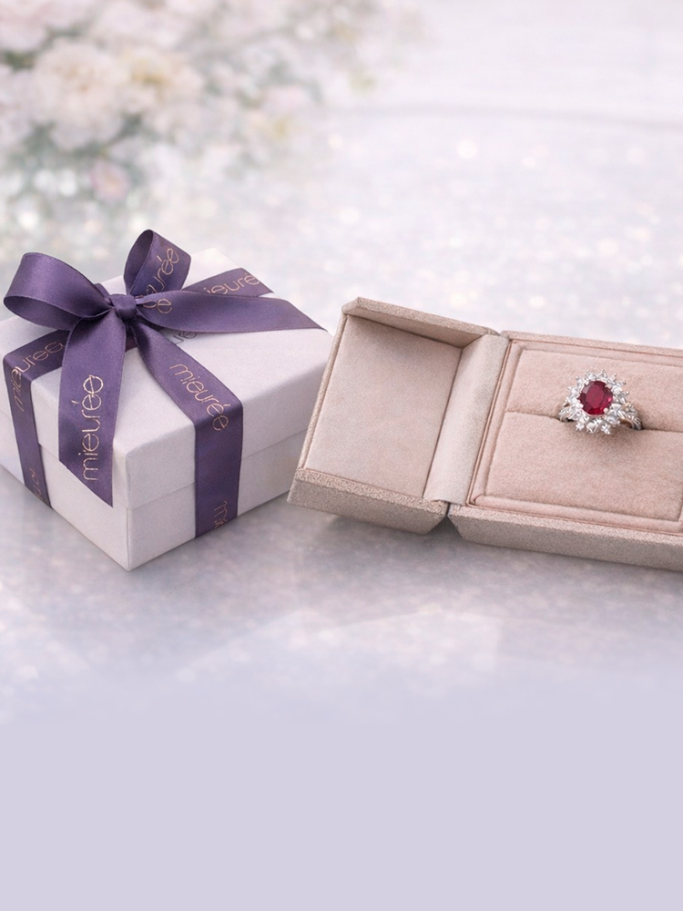 ミューリーでは、専用のボックスにお入れし、リボンをおかけしてお届けいたします。 ジュエリーのサイズに合わせて、最適な大きさのボックスをお選びしています。 ※ 商品購入時のみ承ります。