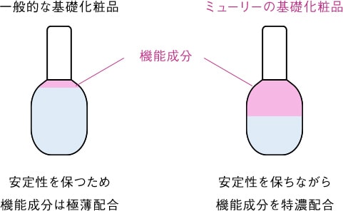 ミューリーはそもそも開発の考え方から違います。肌に有効な美容機能成分をまず限界まで配合し、そこから安定性など中身のバランスを模索して調整を進めます。開発の効率は悪いのですが、肌への実感が最も重要だと考えて、最適な処方をゼロからつくっています。