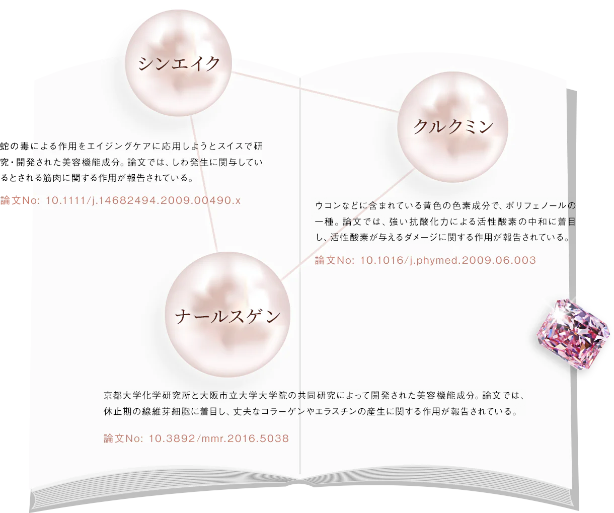 単なる流行り成分や話題性のある成分ではなく、 学術論文によって科学的に実証された、本当の意味で力のある美容機能成分を厳選して使用します。