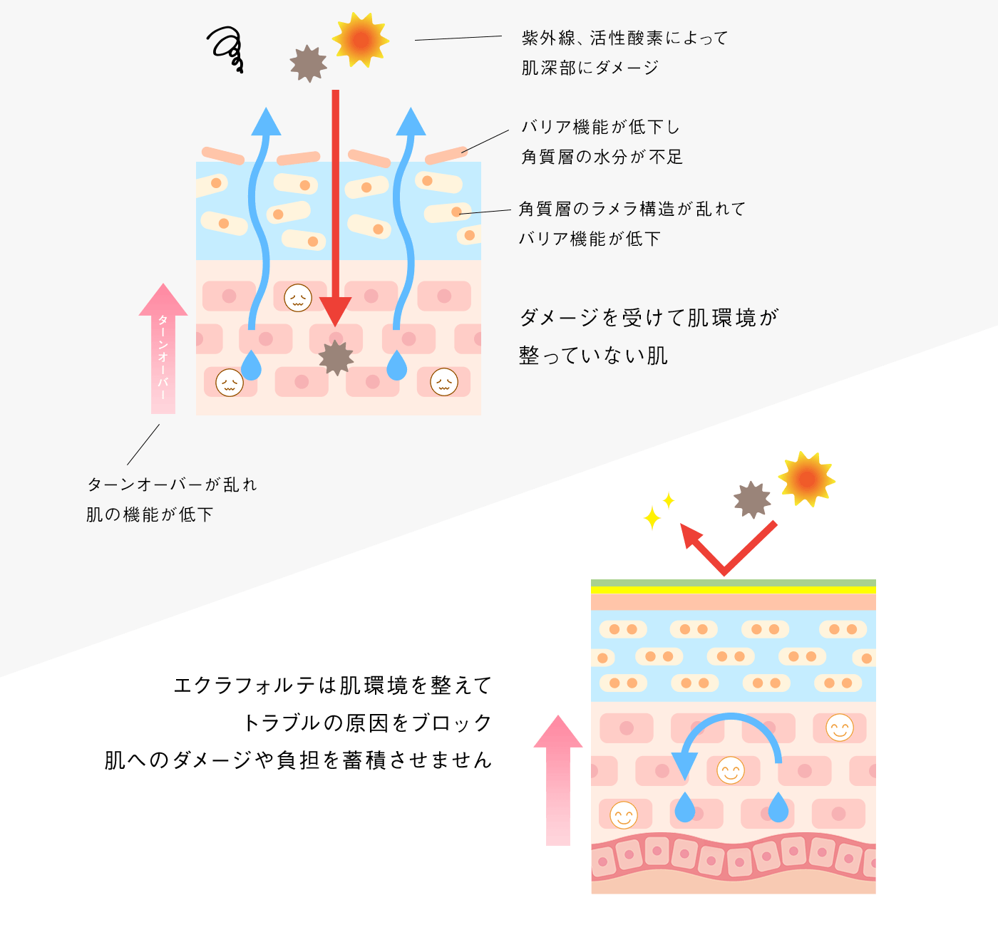 オリジナル美容液をさらに見直し、中身に徹底的にこだわり抜いた結果、考えられないほどの濃度と、それを安定させるギリギリのバランスが実現できました。それがケタ外れの特濃美容液「エクラフォルテ」です。