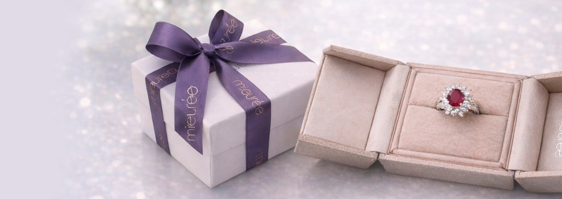 ミューリーでは、専用のボックスにお入れし、リボンをおかけしてお届けいたします。 ジュエリーのサイズに合わせて、最適な大きさのボックスをお選びしています。 ※ 商品購入時のみ承ります。